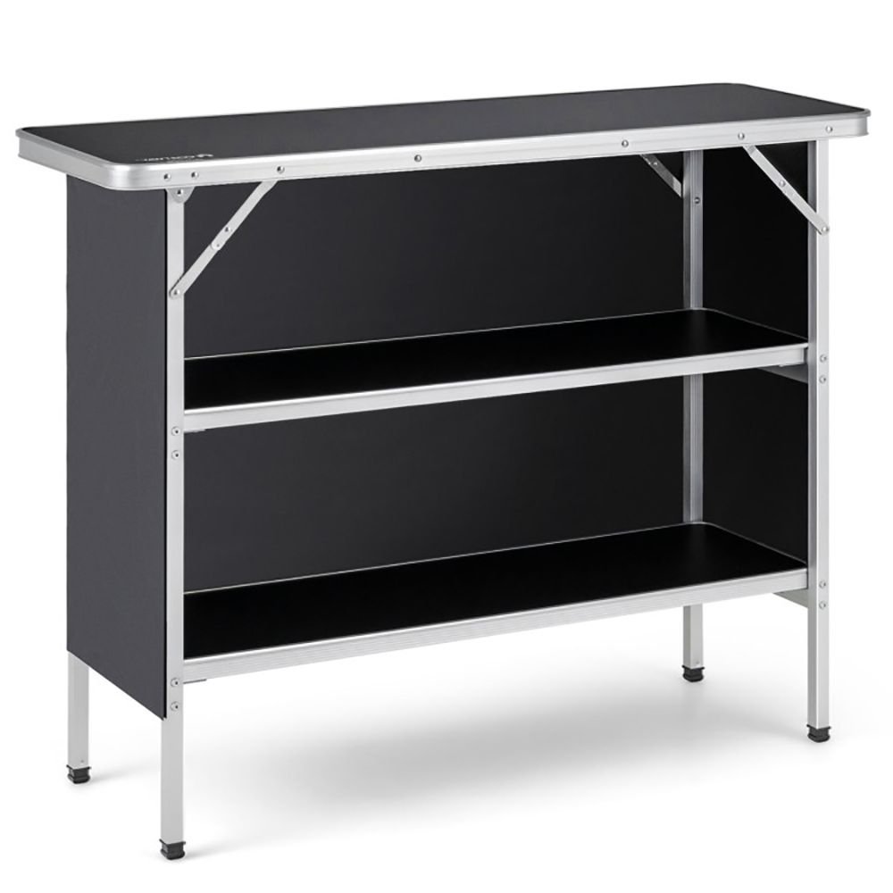 1.Sufficient and Classified Storage: This camping table features a 43.5" wide tabletop and 2-tier storage shelves, proving sufficient space for you to store different items. You can place cups, drinks, cookware and pots on the top, and place snacks, fruits, tableware and cooking meals on the shelves.