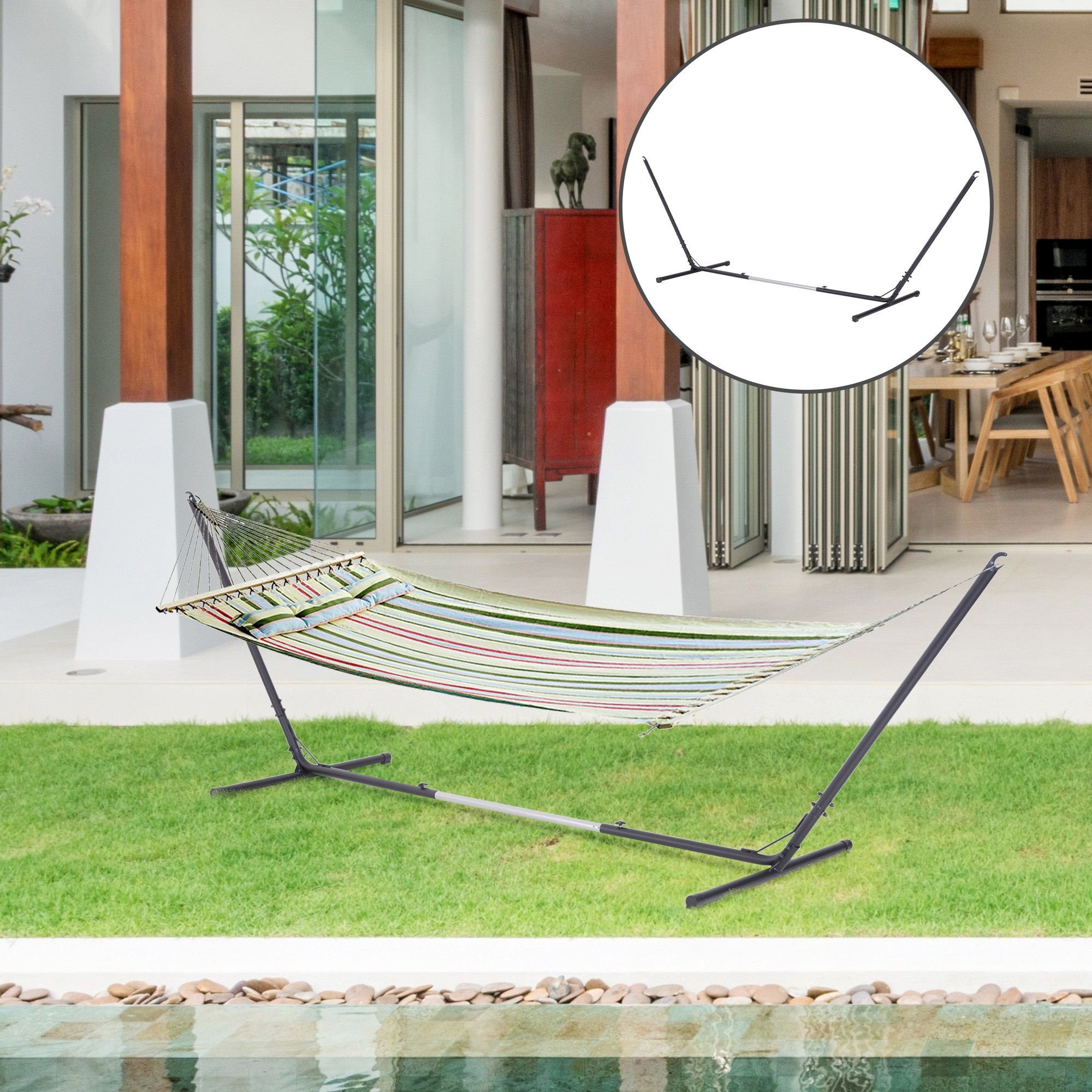 3.- VERSATILE USE: This stand lets you enjoy your hammock anywhere, no trees needed! Relax in style in your courtyard, patio etc..