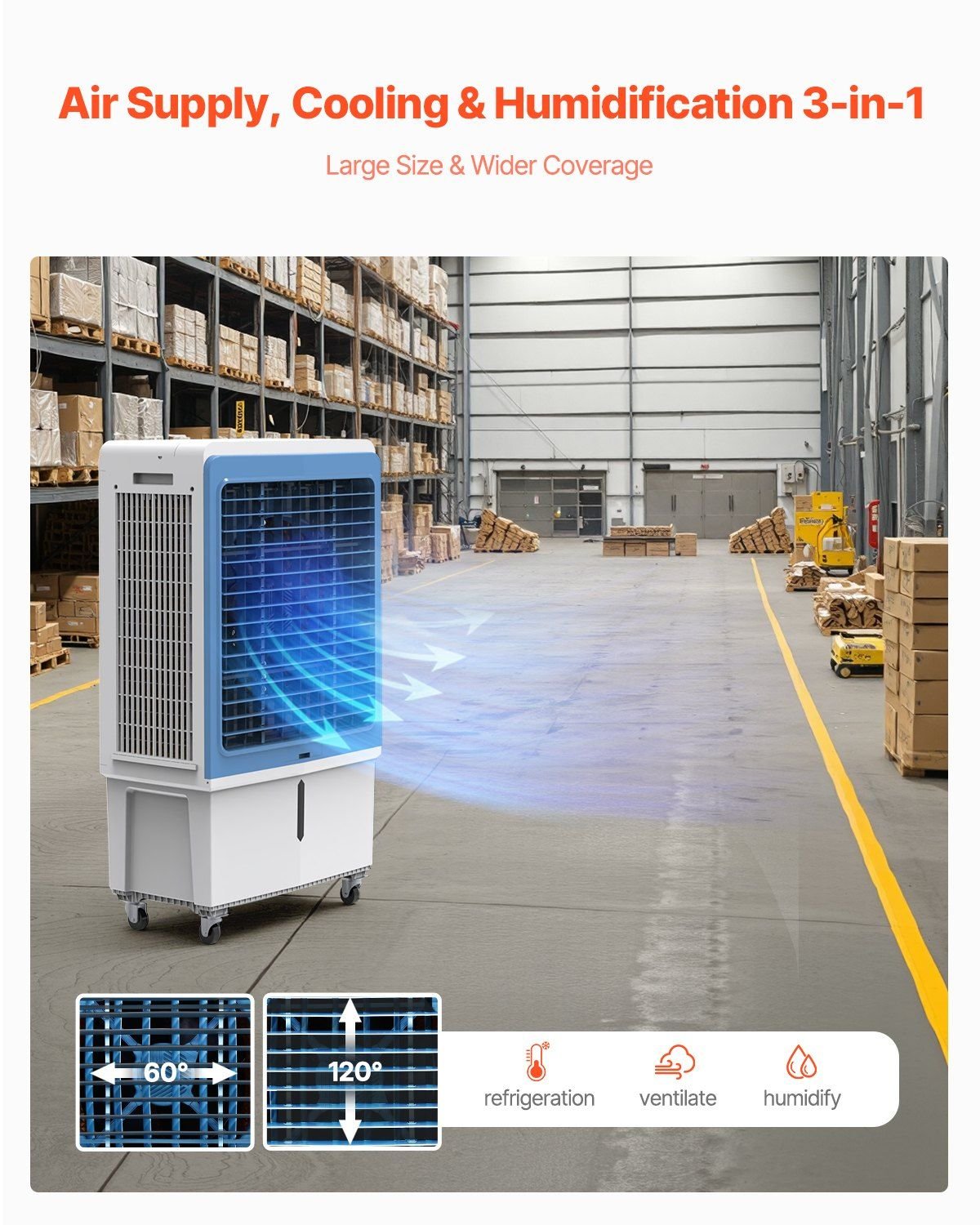 1.Humidifying, Airflow & Cooling 3-in-1: Our evaporative air cooler delivers an airflow of up to 4129 CFM, quickly cooling and refreshing the air. When you need quick cooling in hot weather, place the ice boxes (refrigerated for 4 hours) in the water tank for optimal cooling. 60° horizontal and 120° vertical wide-angle oscillation ensures a cool and comfortable experience in dry outdoor or open indoor environments.